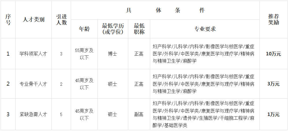 相关待遇:聘期内最高给予50万元奖励补贴。担任市级及以上重点学(专)科负责人/质控中心主任单位给予50万奖励配套,其他引进待遇可“一事一议”。